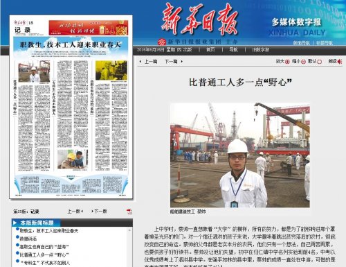 到深圳工作,让蔡帅一下子感觉到扬眉吐气,在老家村子里,父母亲戚也都觉得脸上有光。在公司里,蔡帅经过为期3个月的培训就上岗了,担任“船体主管”,负责船舶的现场建造。公司建造的都是海工船,挖泥船、半潜泊船、石油钻井平台等等,蔡帅很快适应了工作,“可能是职业教育培养了我一种思维习惯,就是一边动手一边动脑,在实践中积累经验,一步一个脚印。”蔡帅一方面把自己定位为一个普通工人,任劳任怨,从来不拈轻怕重;另一方面,又觉得自己要和普通工人不同,要有一点“野心”,多多积累理论知识,提高各方面的素质。